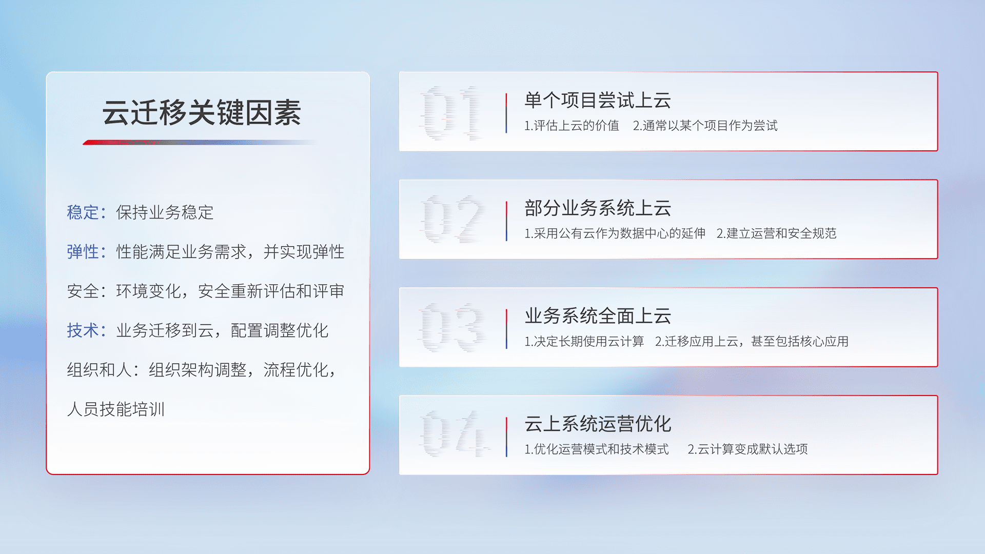 结合实际业务,,,,从规划设计、、、、云平台选型、、云原生改造、、、、数据迁移、、集成交付,,,,迁移全过程为客户识别最佳上云路径,,,,做好风险识别管理,,,设计网络架构、、身份权限、、、安全审计合规、、、、操作审计、、、、日志审计、、、、监控告警策略、、多站点容灾设计等,,,,对云上基础设施进行整体规划,,,提升IT治理水平,,,,以满足弹性、、、高可用、、高性能的需求。。。