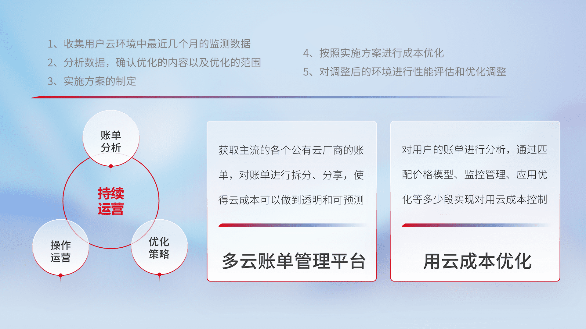 通过多云纳管,,,,以统一的资源数据模型把客户的云资源进行抽象和封装,,,,进而实现对多云资源的统一操作,,,,保障云资源管理的可靠性、、稳定性与可用性。。。。量身定制化运维内容,,,配置、、开发运维、、、、补丁管理、、、、备份、、、、监控、、认证和访问管理、、、、审计和日常巡检等,,,,保障在用云过程中的可靠度,,,稳定度以及高可用率。。